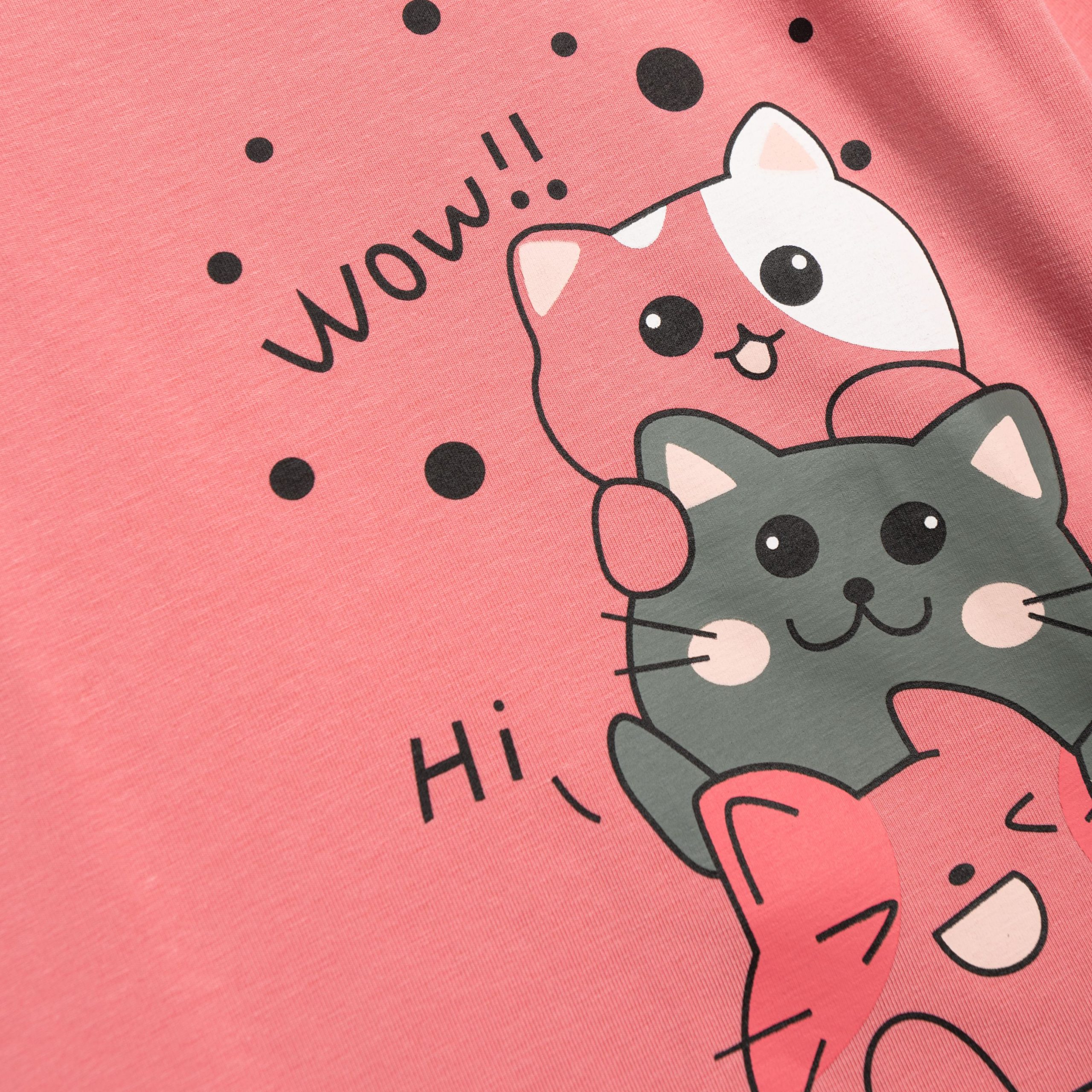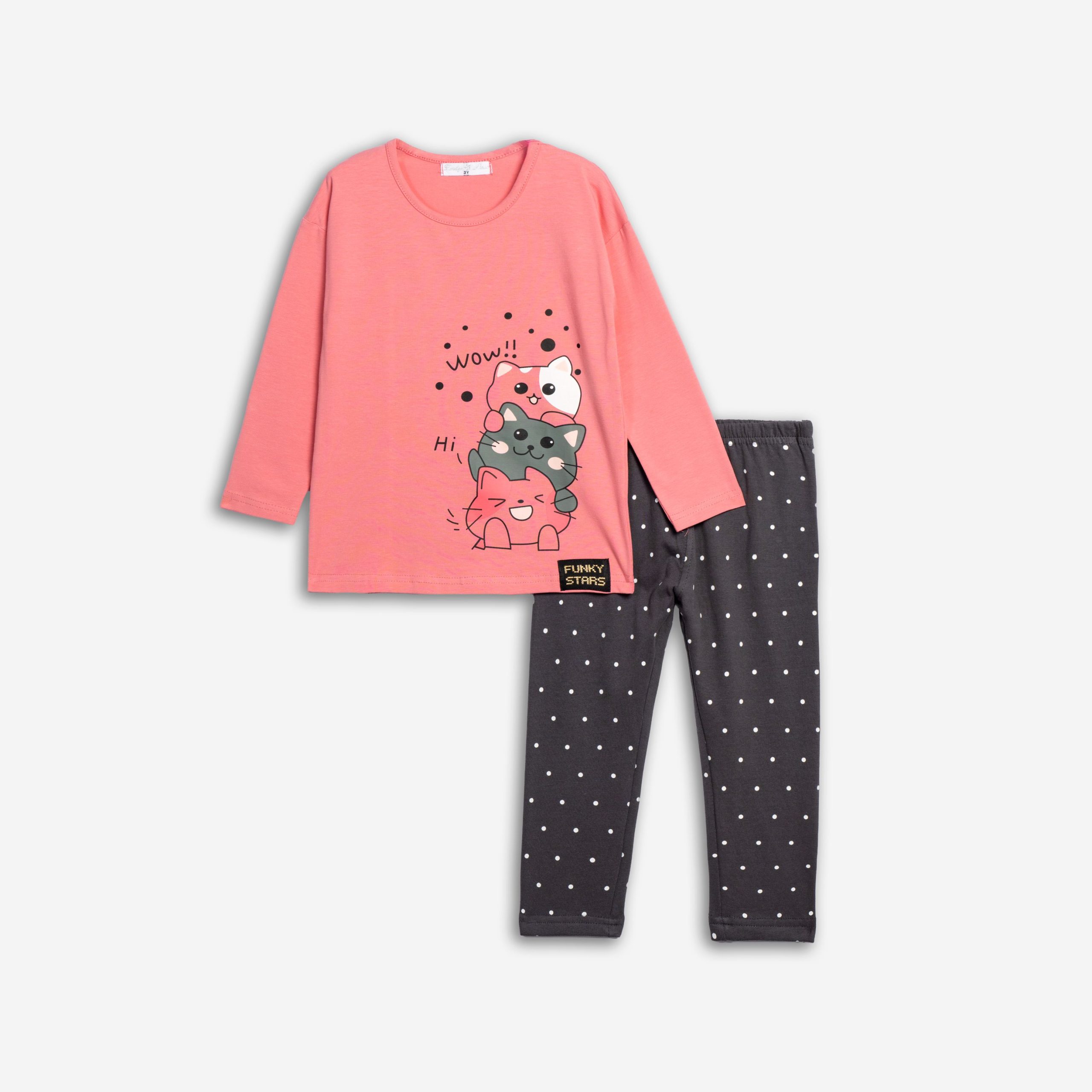 Μπλουζοφόρεμα με κολάν φούτερ λύκρα για κορίτσι 2-6 ετών σε χρώμα blush/ ανθρακί allover με τύπωμα (γατούλες) και πουά κολάν