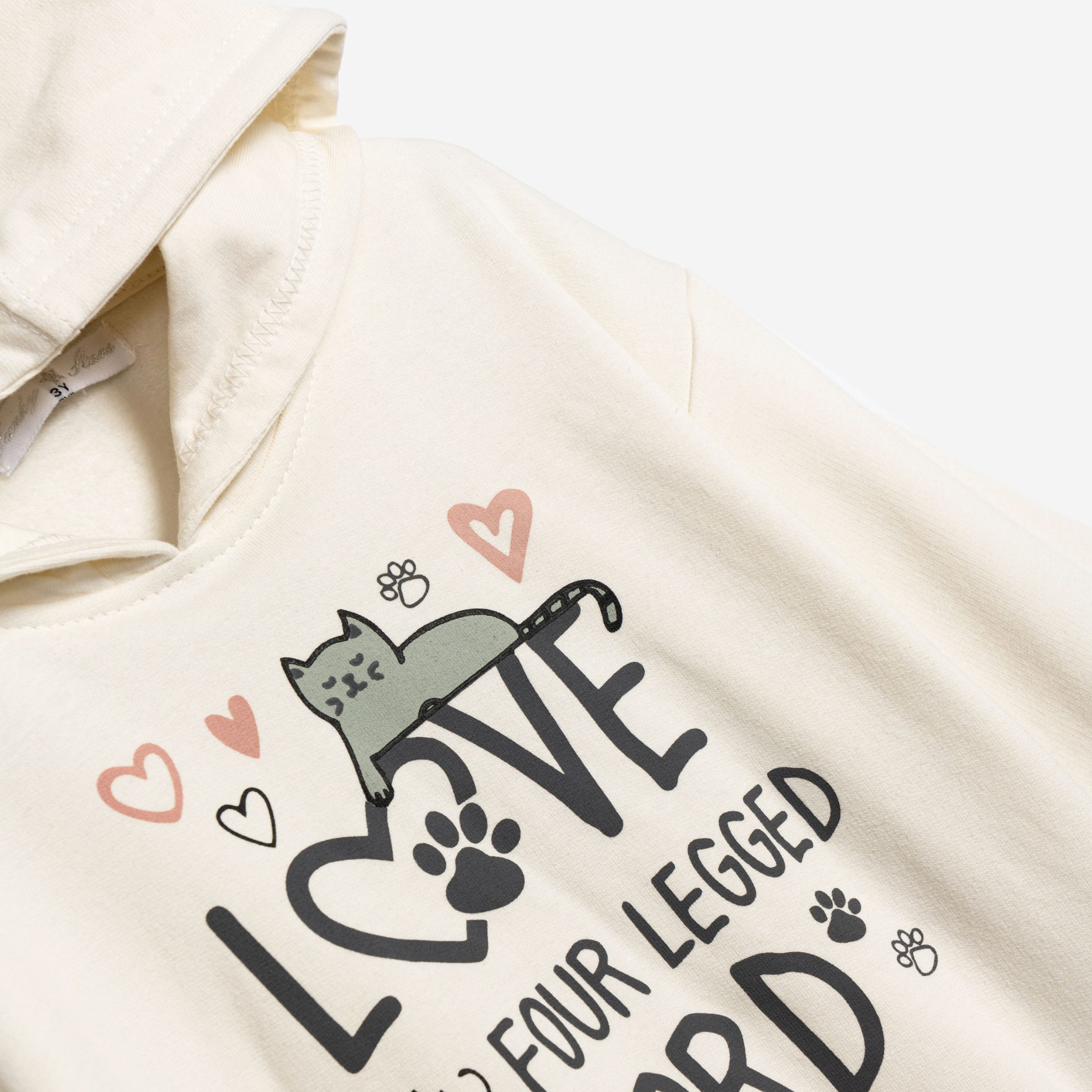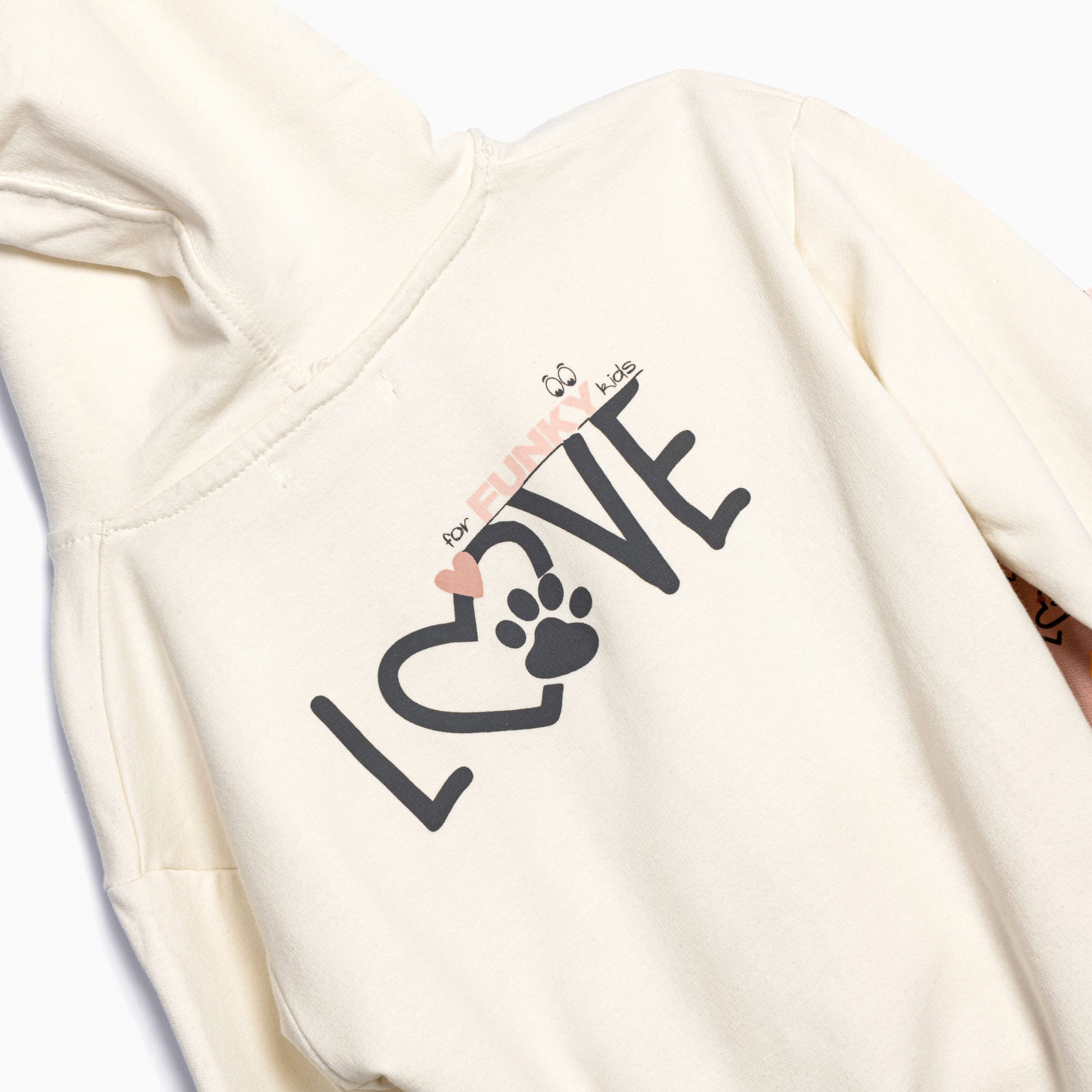 Μπλουζοφόρεμα με κολάν με κουκούλα για κορίτσι 2-6 ετών σε χρώμα εκρού/ ροζ πούδρας allover (καρδιές) και τύπωμα στην μπλούζα