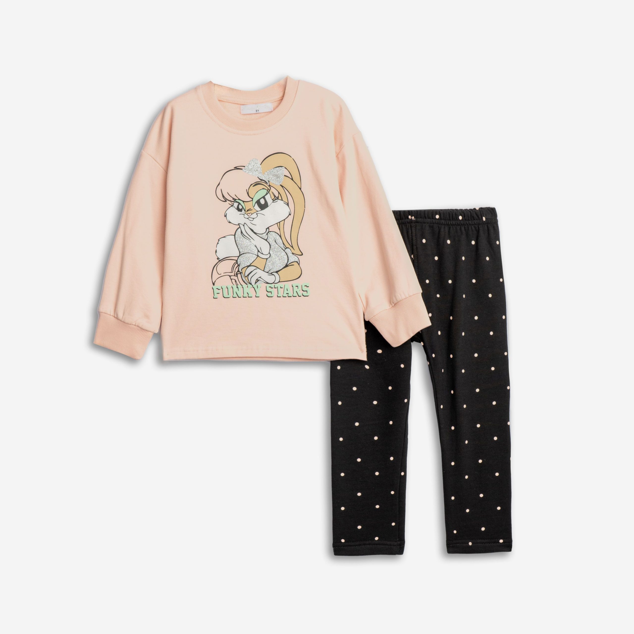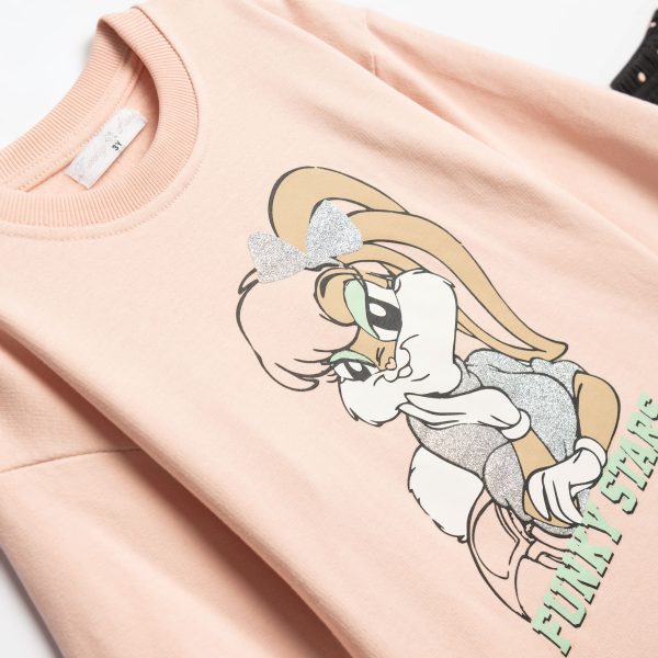 Μπλουζοφόρεμα με κολάν φούτερ λύκρα για κορίτσι 2-6 ετών σε χρώμα ροζ πούδρας/ μαύρο allover με τύπωμα λαγουδάκι