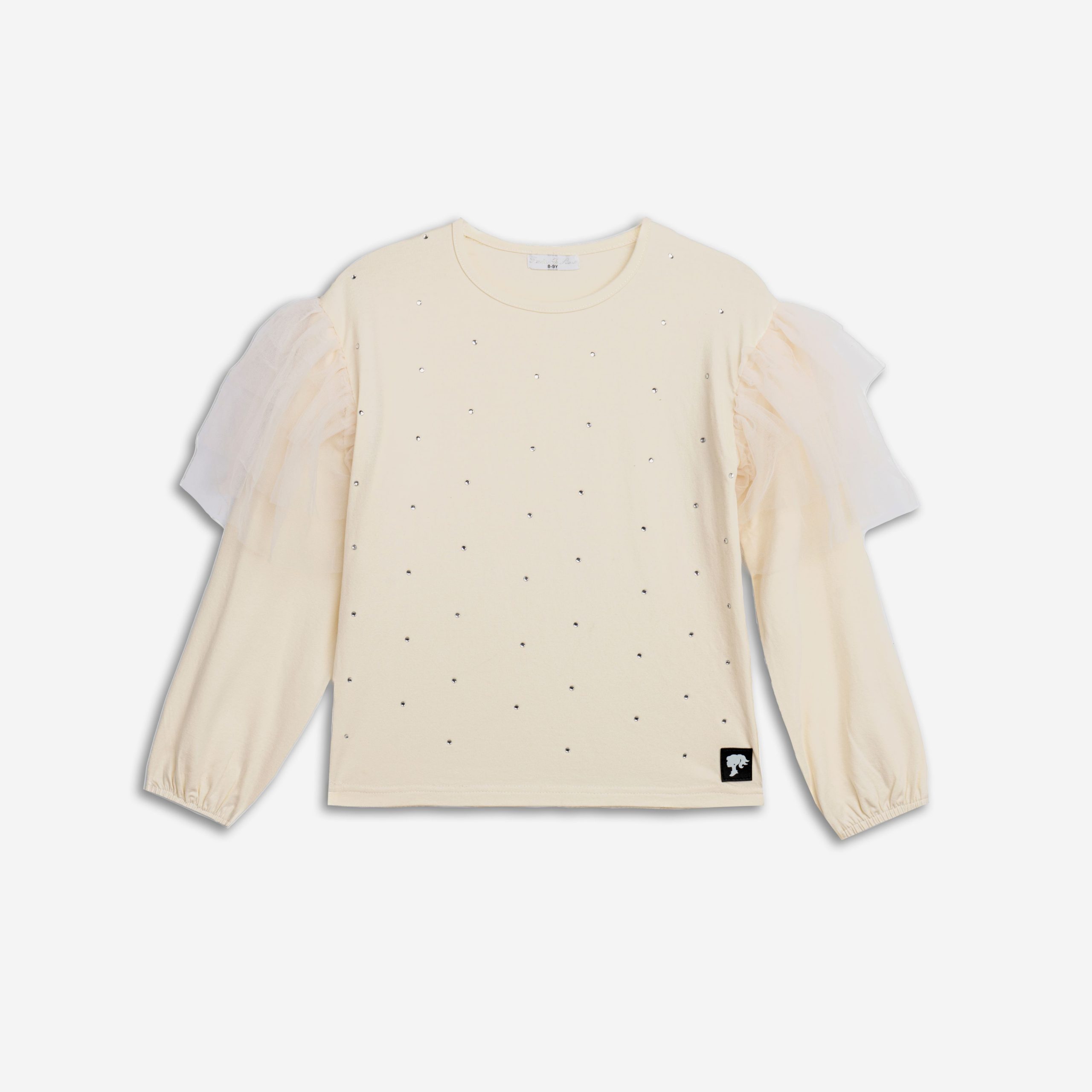 Μπλούζα κάλτσα λύκρα με στρας allover και τούλι μαλακό στα μανίκια για κορίτσι 6-16 χρονών σε χρώμα εκρού