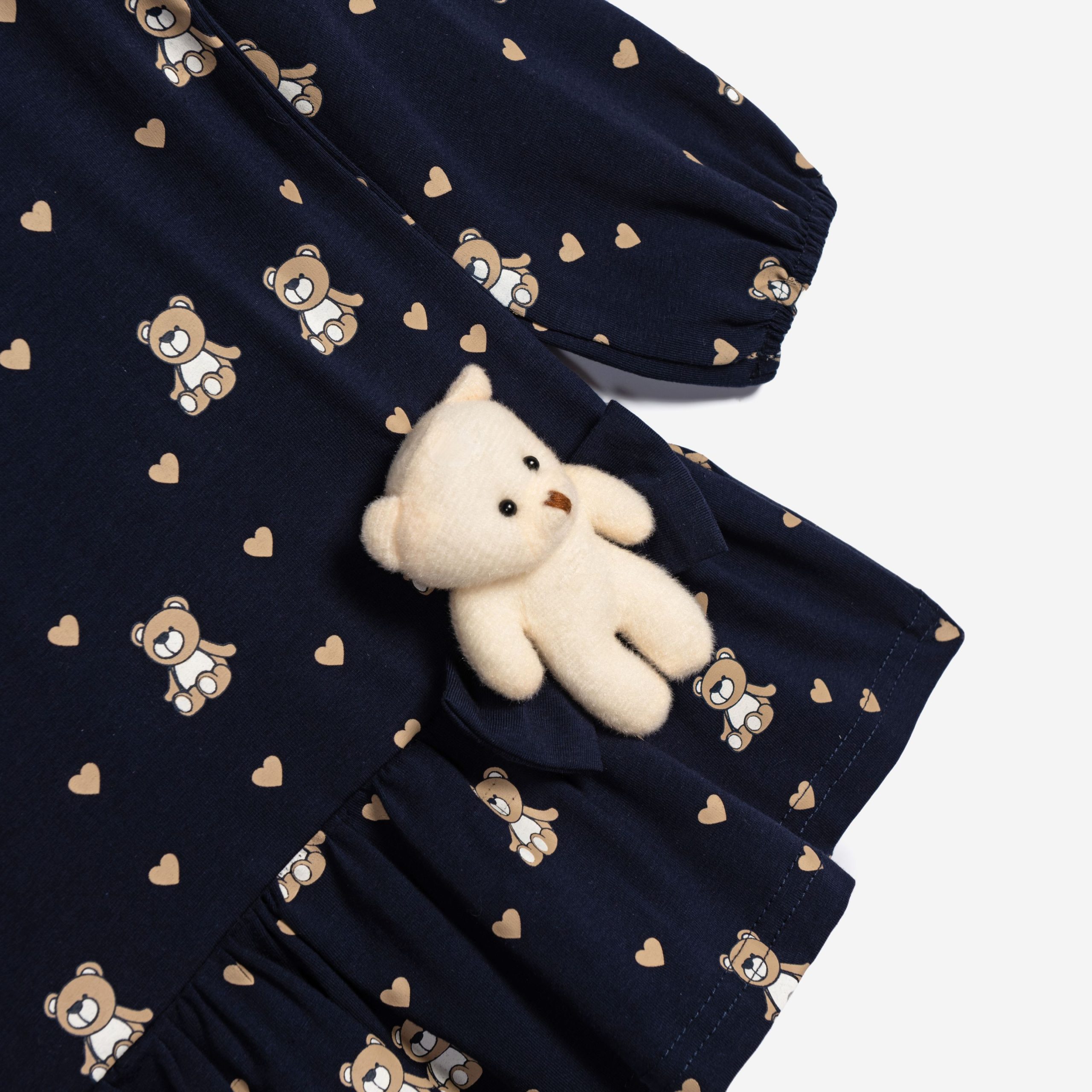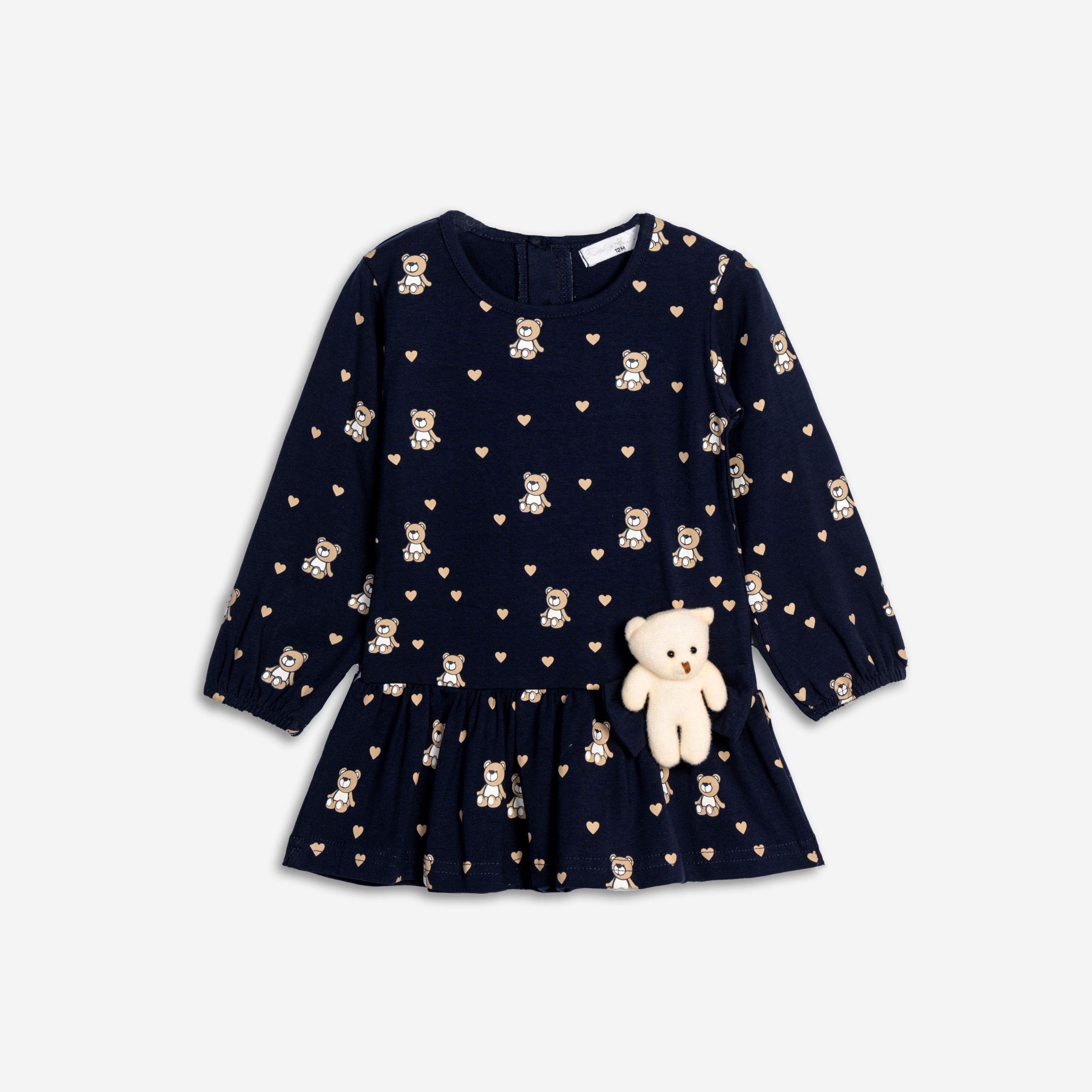 Φόρεμα κάλτσα λύκρα με τύπωμα (αρκουδάκια) allover και κούκλακι αρκουυδάκι για κορίτσι 6-24 μηνών σε χρώμα μπλε allover