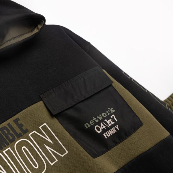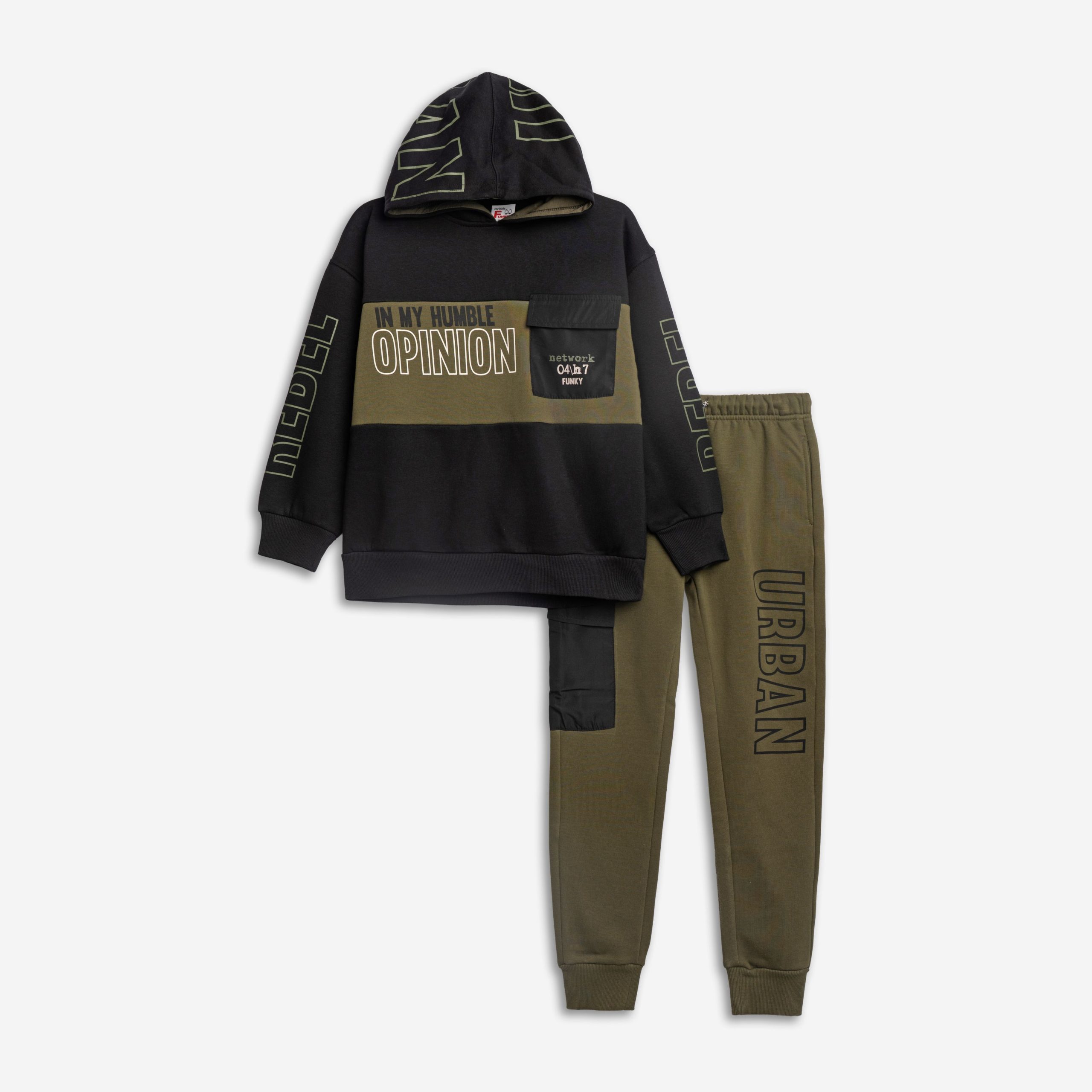 Φόρμα φούτερ με κουκούλα, τύπωμα στην μπλούζα, στην κουκούλα και στο παντελόνι για αγόρι 6-16 χρονών σε χρώμα μαύρο-χακί/χακί-μαύρο