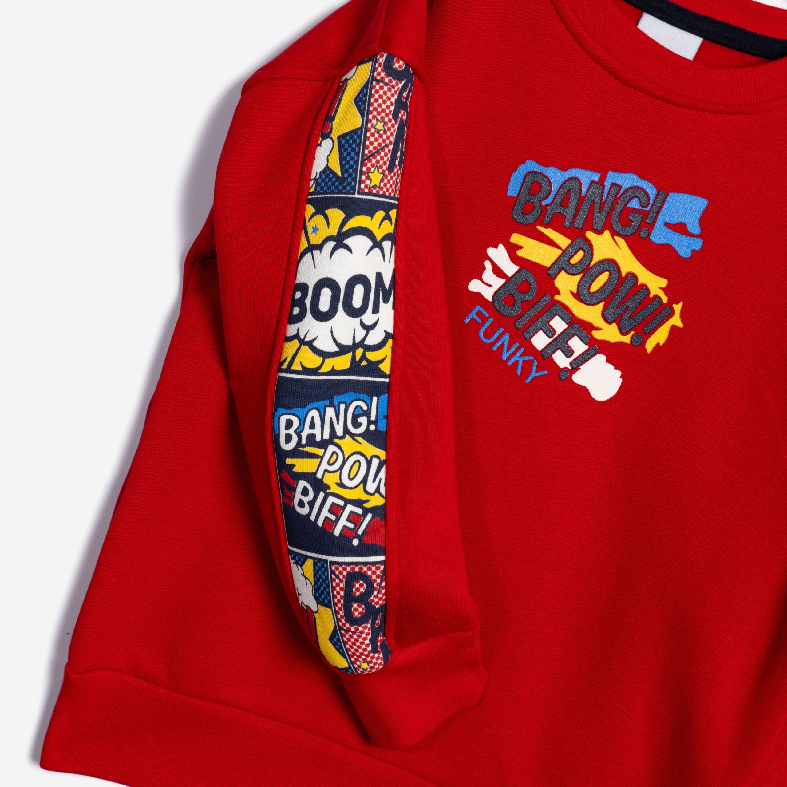 Φόρμα φούτερ για αγόρι 2-6 ετών σε χρώμα κόκκινο/ κόκκινο και τύπωμα στα μανίκια και στο παντελόνι.