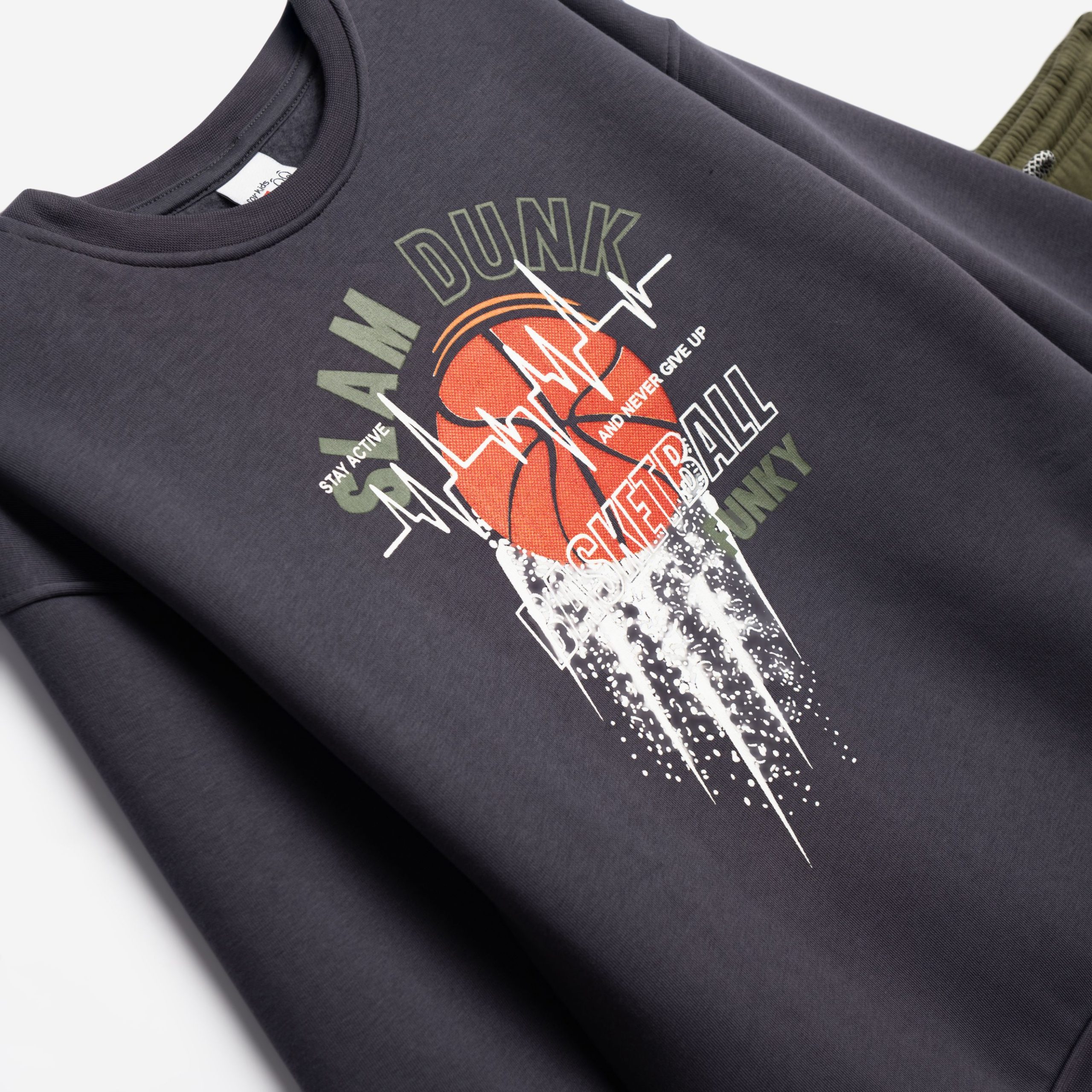 Φόρμα φούτερ με τύπωμα (μπάλα μπάσκετ) για αγόρι 6-16 χρονών σε χρώμα ανθρακί/χακί