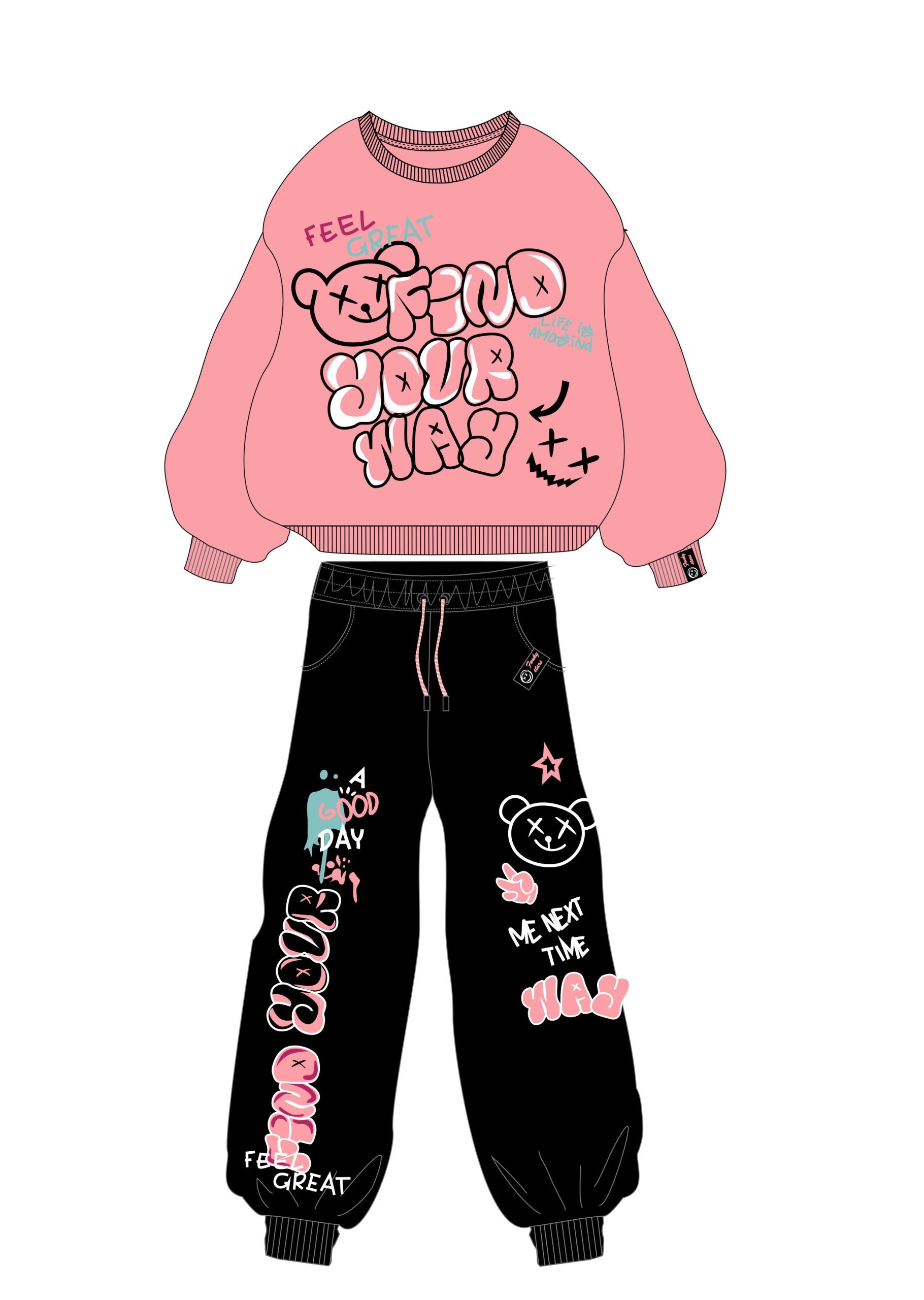 Φόρμα φούτερ με τύπωμα allover στην μπλούζα και στο παντελόνι για κορίτσι 6-16 χρονών σε χρώμα blush/μαύρο