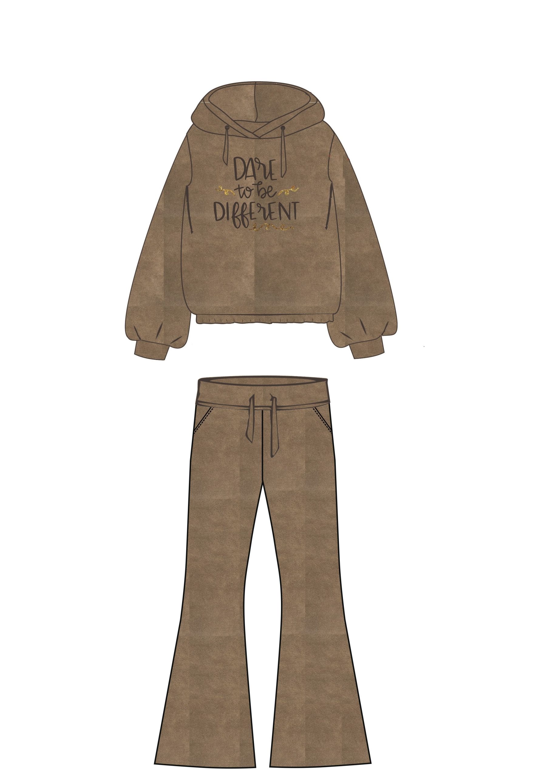 Φόρμα βελουτέ με κουκούλα και τύπωμα για κορίτσι 6-16 χρονών σε χρώμα ανοιχτό καφέ/ανοιχτό καφέ