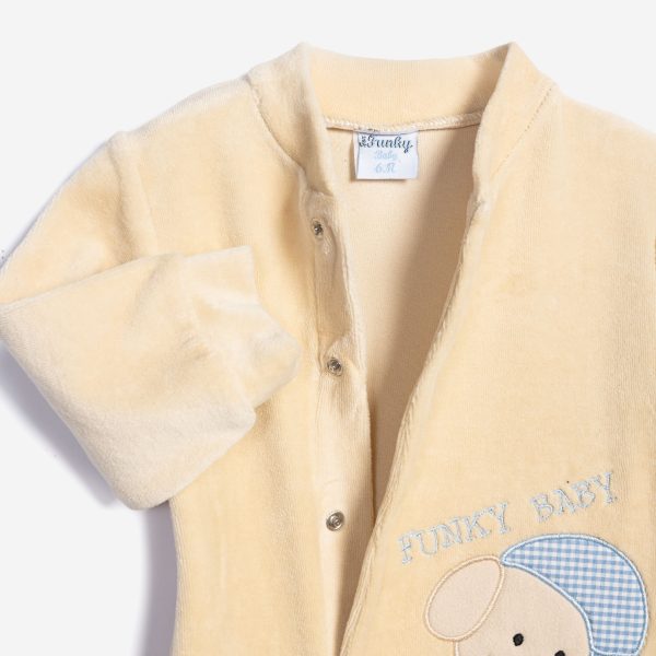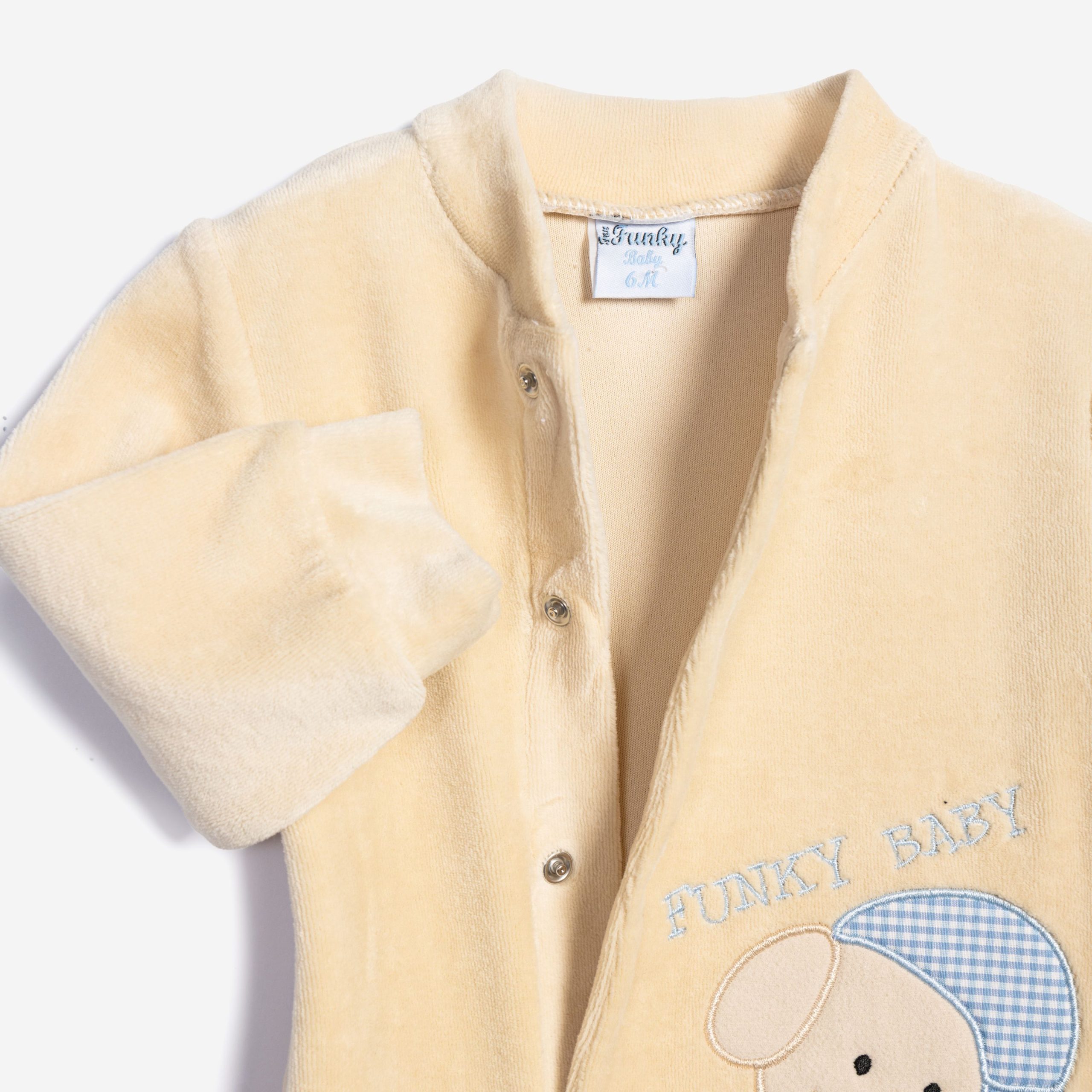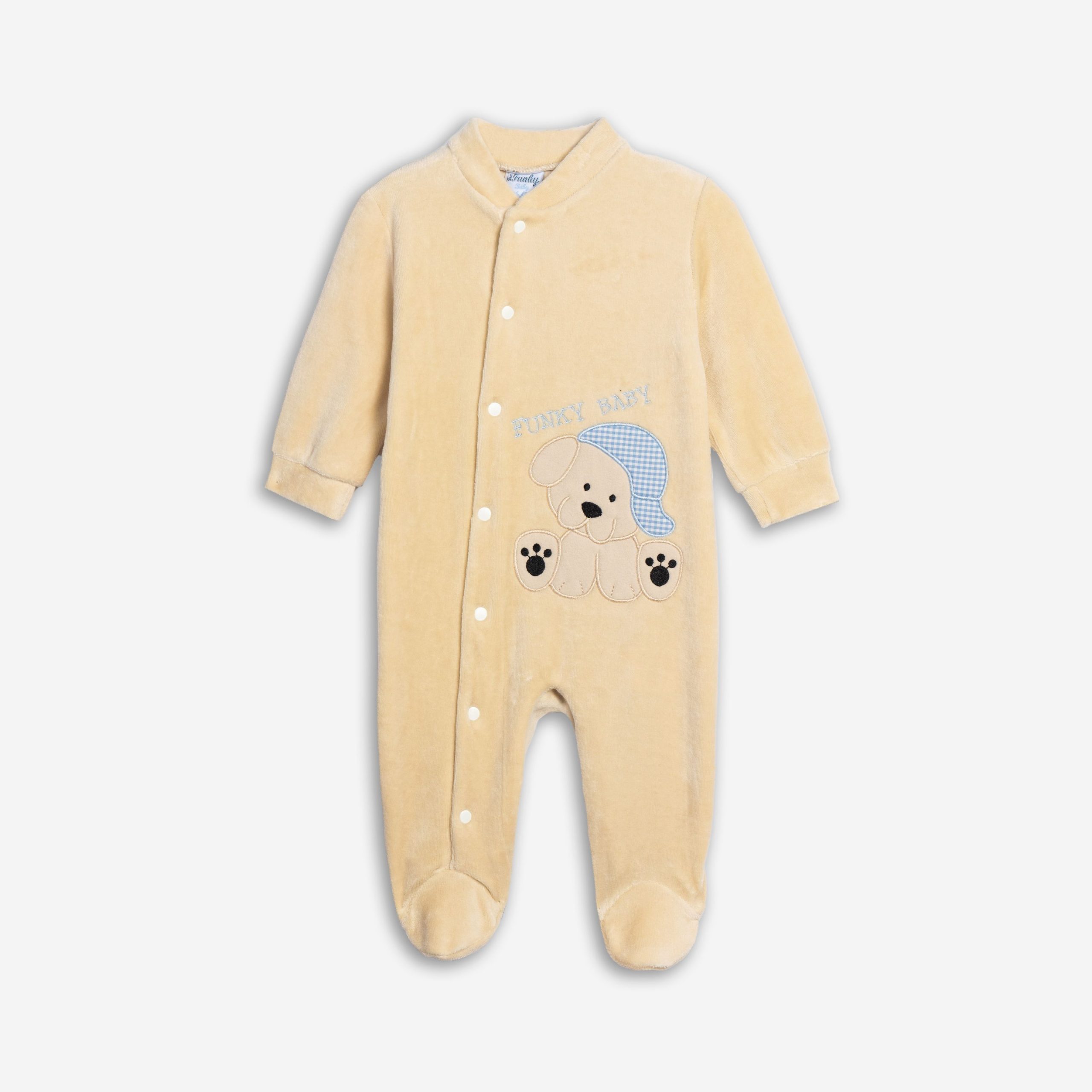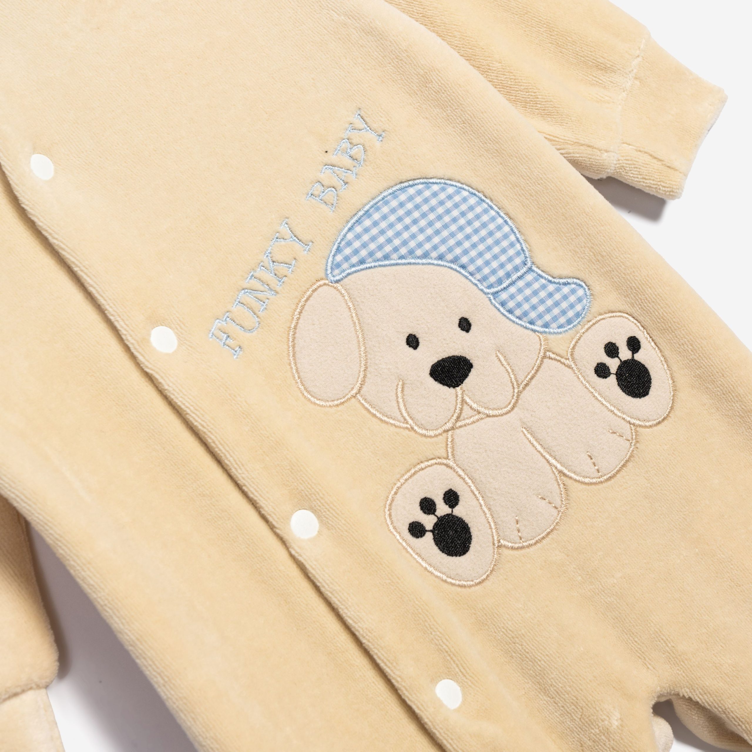 Φορμάκι μακρυμάνικο βελουτέ με τύπωμα σκυλάκι σε χρώμα μπεζ βρεφανάπτυξη για 0-24 μηνών αγόρι
