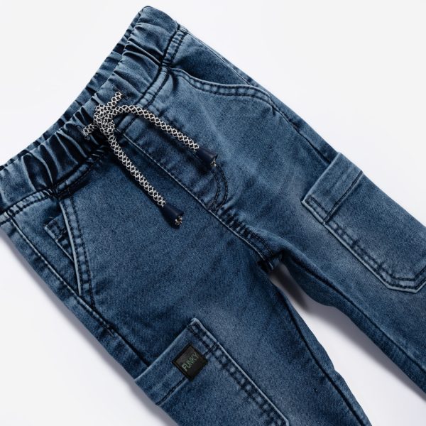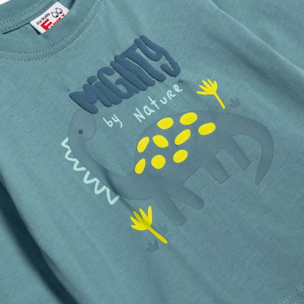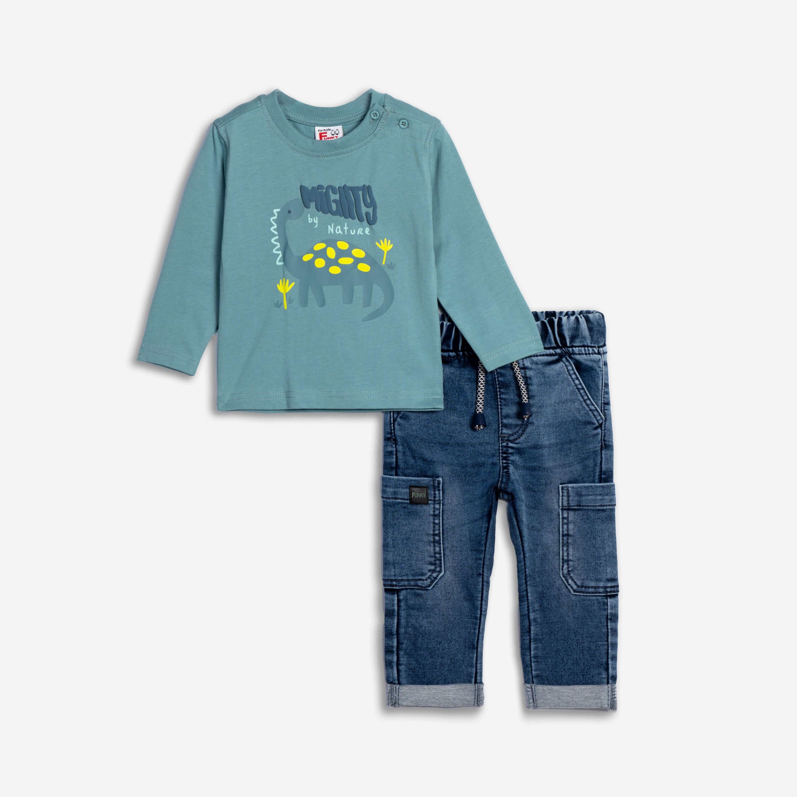Σετ 2τεμαχίων μπλούζα κάλτσα με τύπωμα (δεινόσαυρους) και παντελόνι τύπου cargo τζην λύκρα μαλακό για αγόρι 6-24 μηνών σε χρώμα latigo bay/μπλε τζην