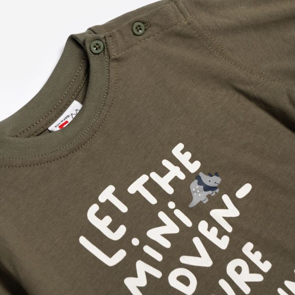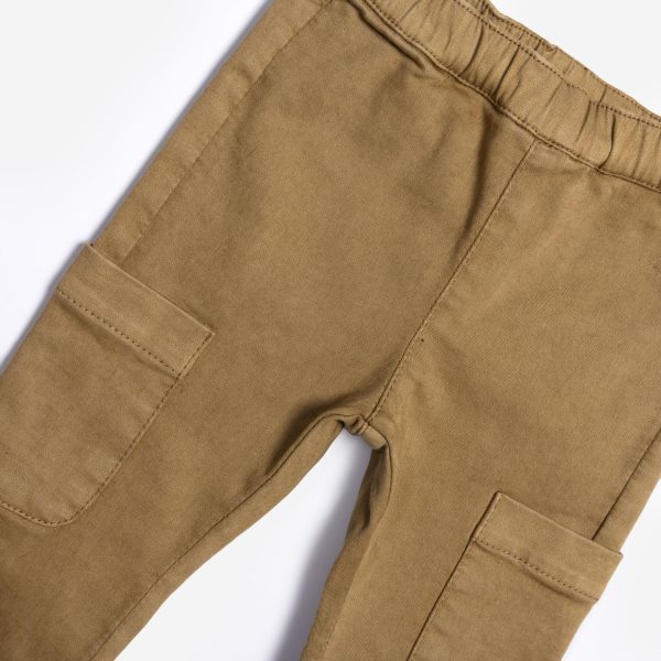 Σετ 2τεμαχίων μπλούζα κάλτσα με τύπωμα και παντελόνι τύπου cargo τζην λύκρα μαλακό για αγόρι 6-24 μηνών σε χρώμα ανοιχτό χακί/καραμέλα