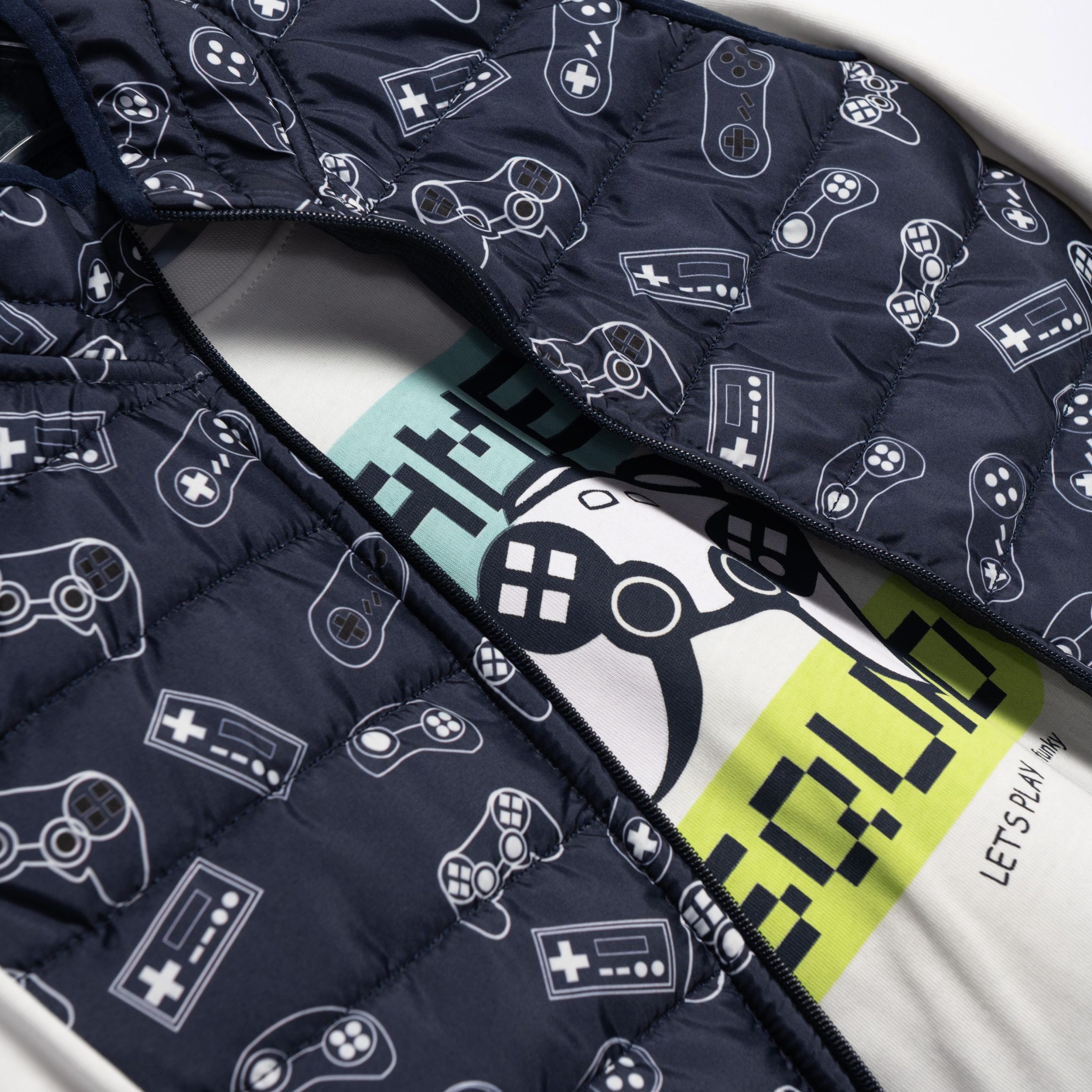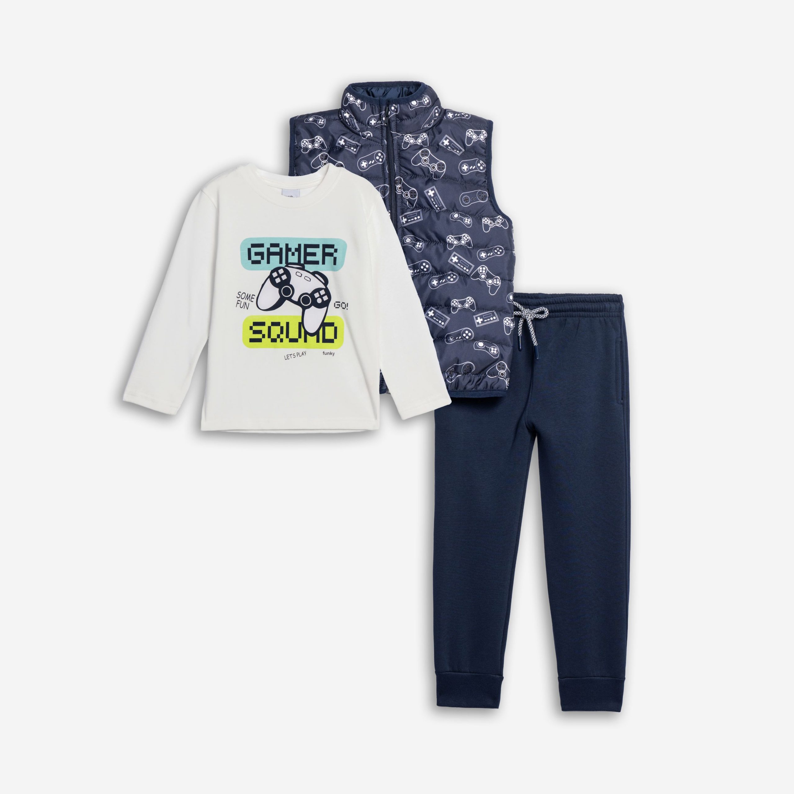 Σετ 3 τεμάχια τζάκετ αμάνικο για αγόρι 2-6 ετών με τύπωμα την μπλούζα και παντελόνι φούτερ σε χρώμα μπλέ/ σκούρο πράσινο/ μπλε
