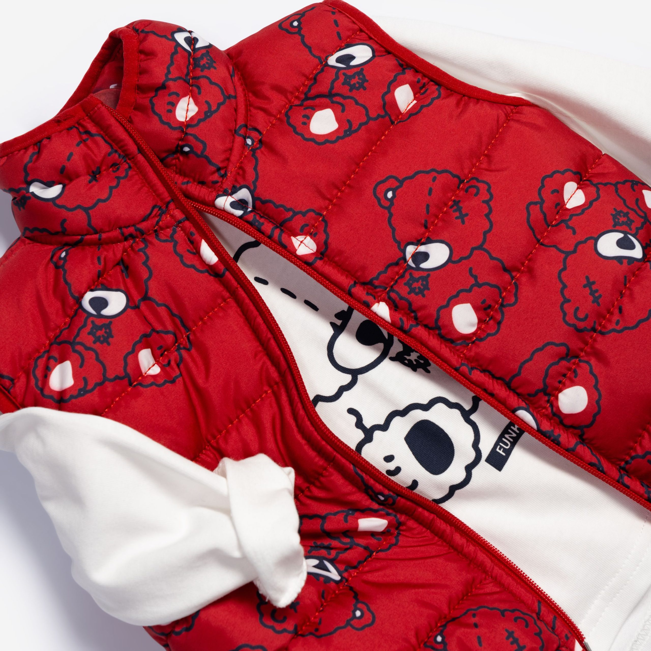 Σετ 3τεμαχίων αμάνικο τζάκετ με τύπωμα allover,μπλούζα κάλτσα με τύπωμα(αρκουδάκι) και παντελόνι φούτερ με τύπωμα για αγόρι 6-24 μηνών σε χρώμα κόκκινο allover/εκρού/μπλε