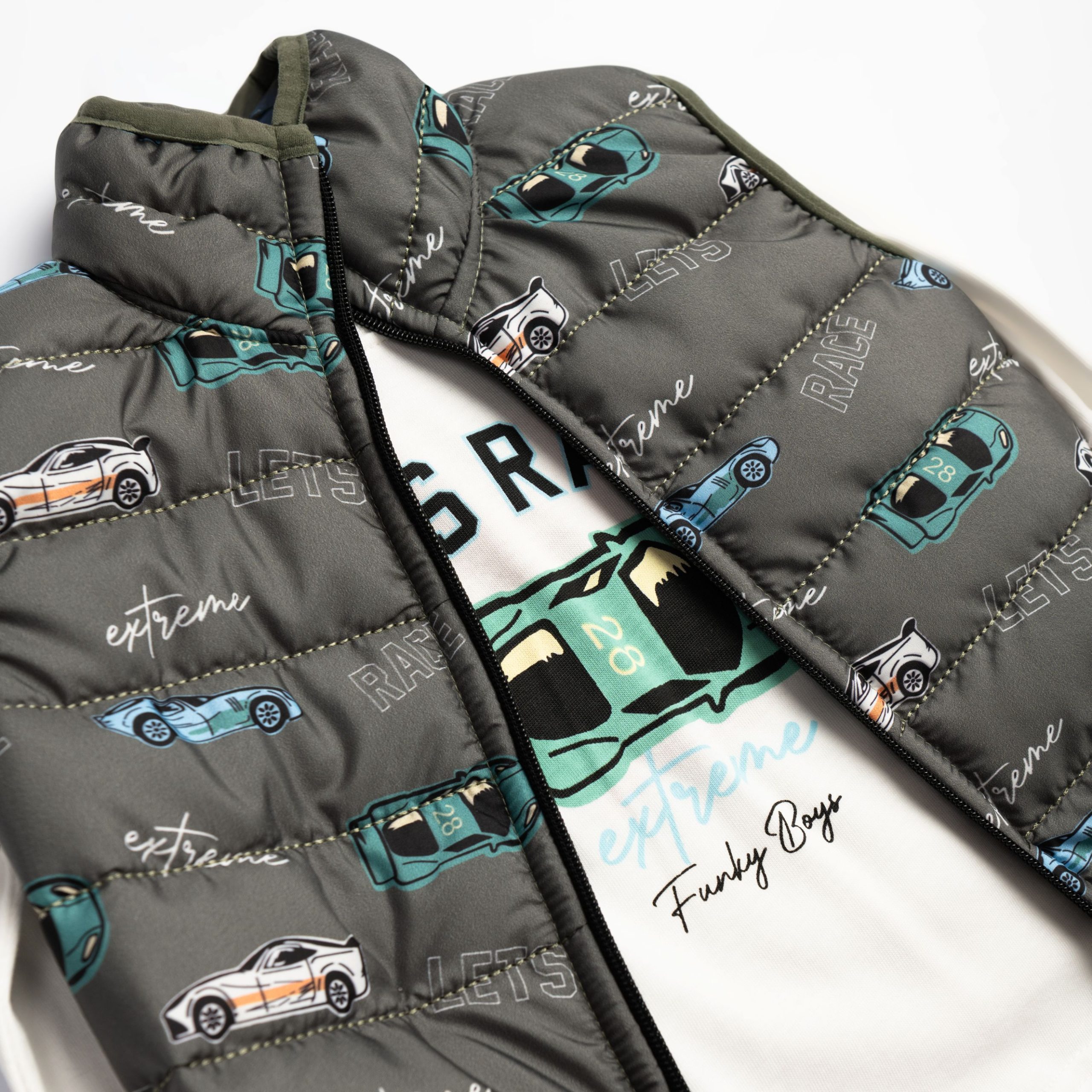 Σετ 3τεμαχίων αμάνικο μπουφάν με τύπωμα allover,μπλούζα κάλτσα με τύπωμα(αυτοκίνητο) και παντελόνι φούτερ για αγόρι 6-24 μηνών σε χρώμα χακί allover/εκρού/μαύρο
