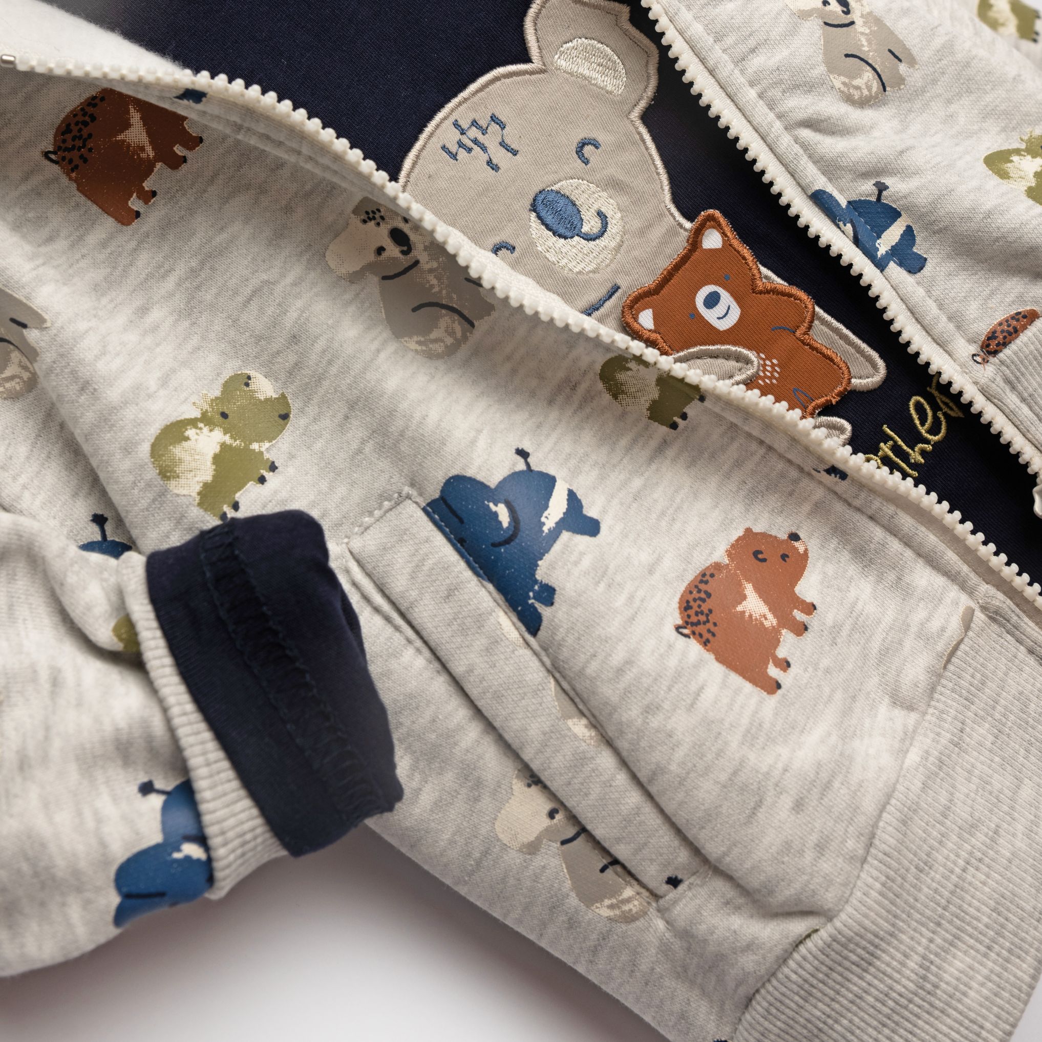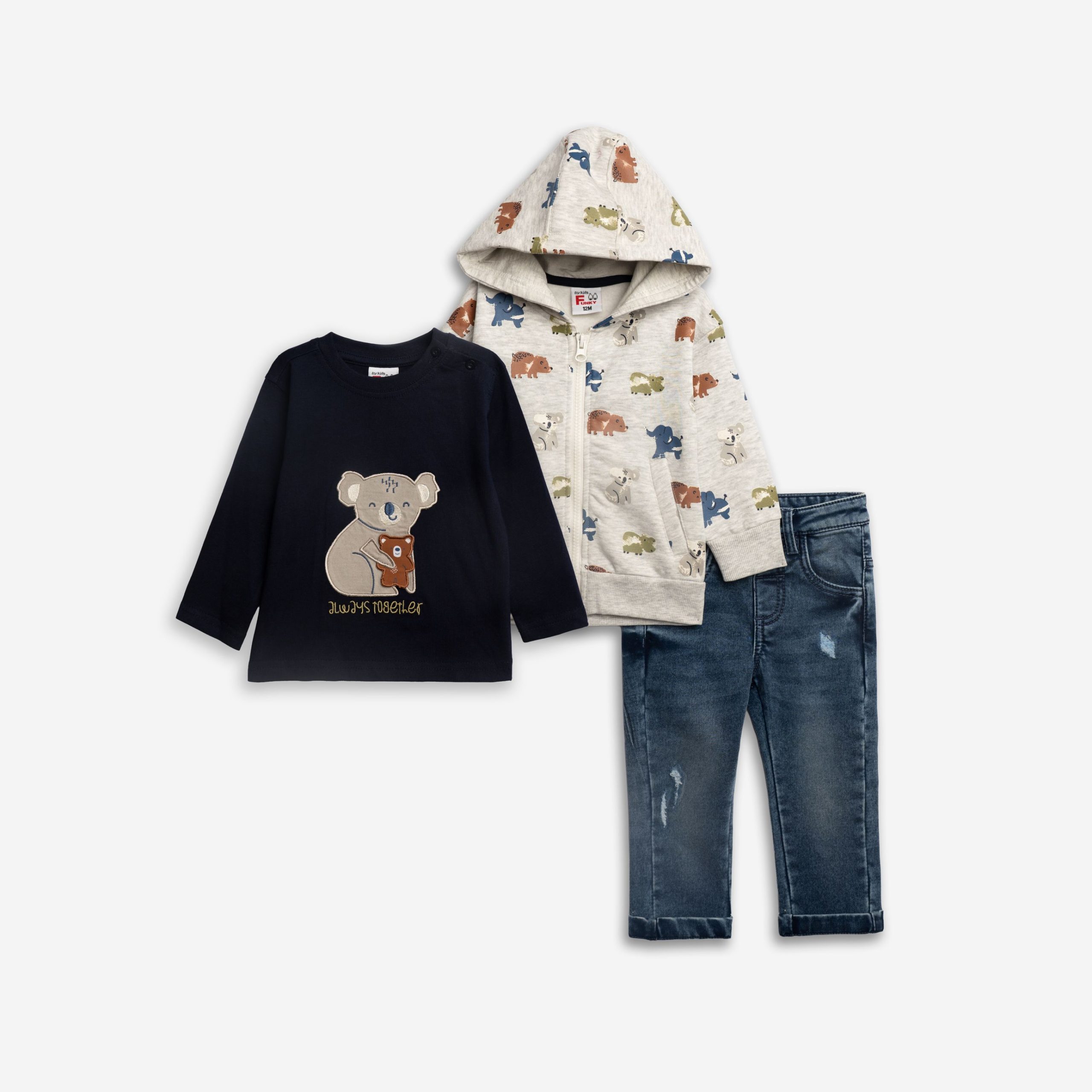 Σετ 3τεμαχίων ζακέτα φούτερ με τύπωμα allover,μπλούζα κάλτσα με τύπωμα(κοάλα) και παντελόνι τζην για αγόρι 6-24 μηνών σε χρώμα ανοιχτό γκρι μελανζέ allover/μπλέ/μπλέ τζην
