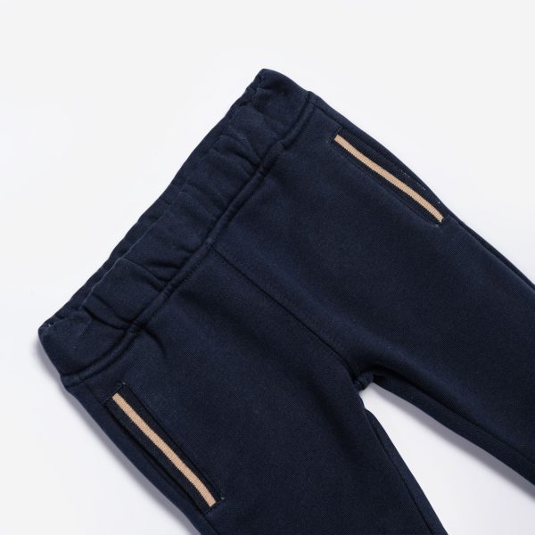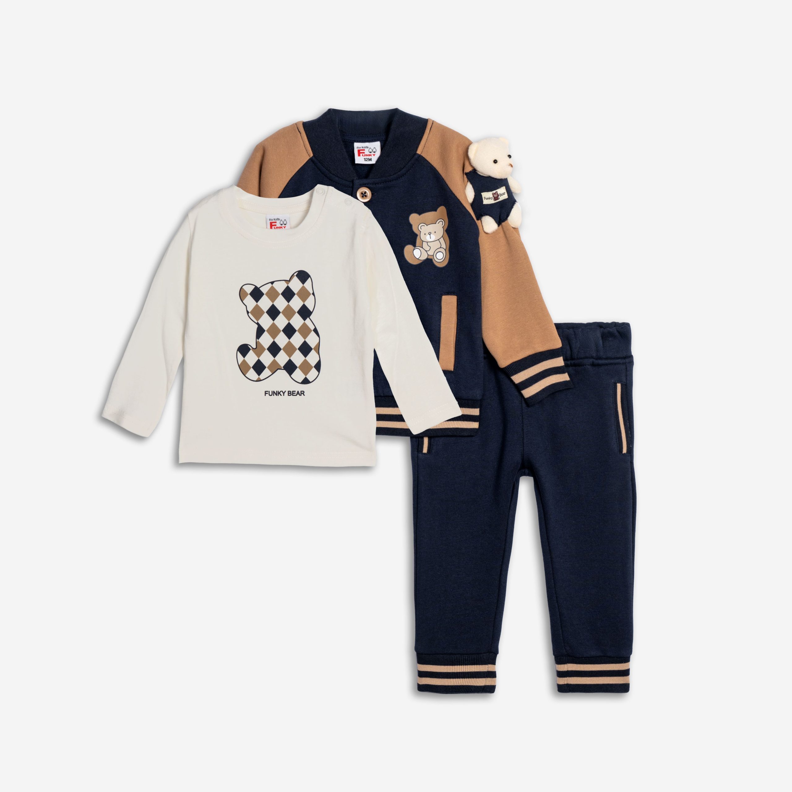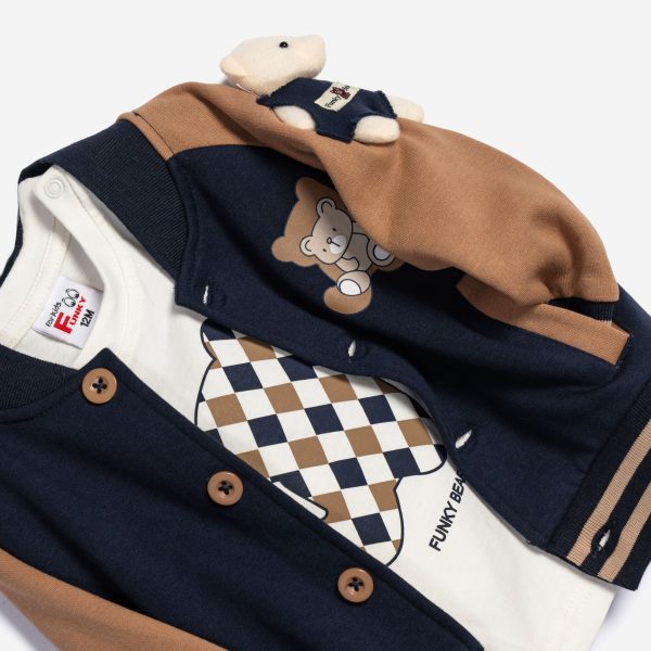 Σετ 3τεμαχίων ζακετά φούτερ με αρκουδάκι ραμμένο στο μανίκι,μπλούζα κάλτσα με τύπωμα(αρκουδάκι) και παντελόνι φούτερ για αγόρι 6-24 μηνών σε χρώμα μπλε-tawny brown/εκρού/μπλε