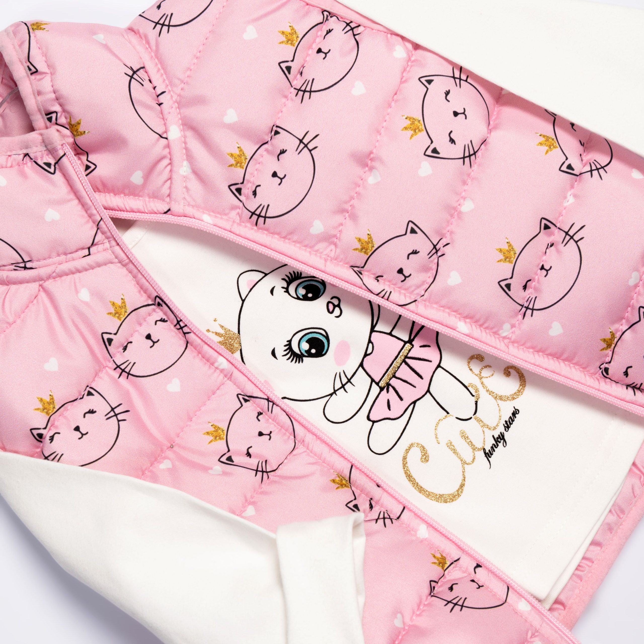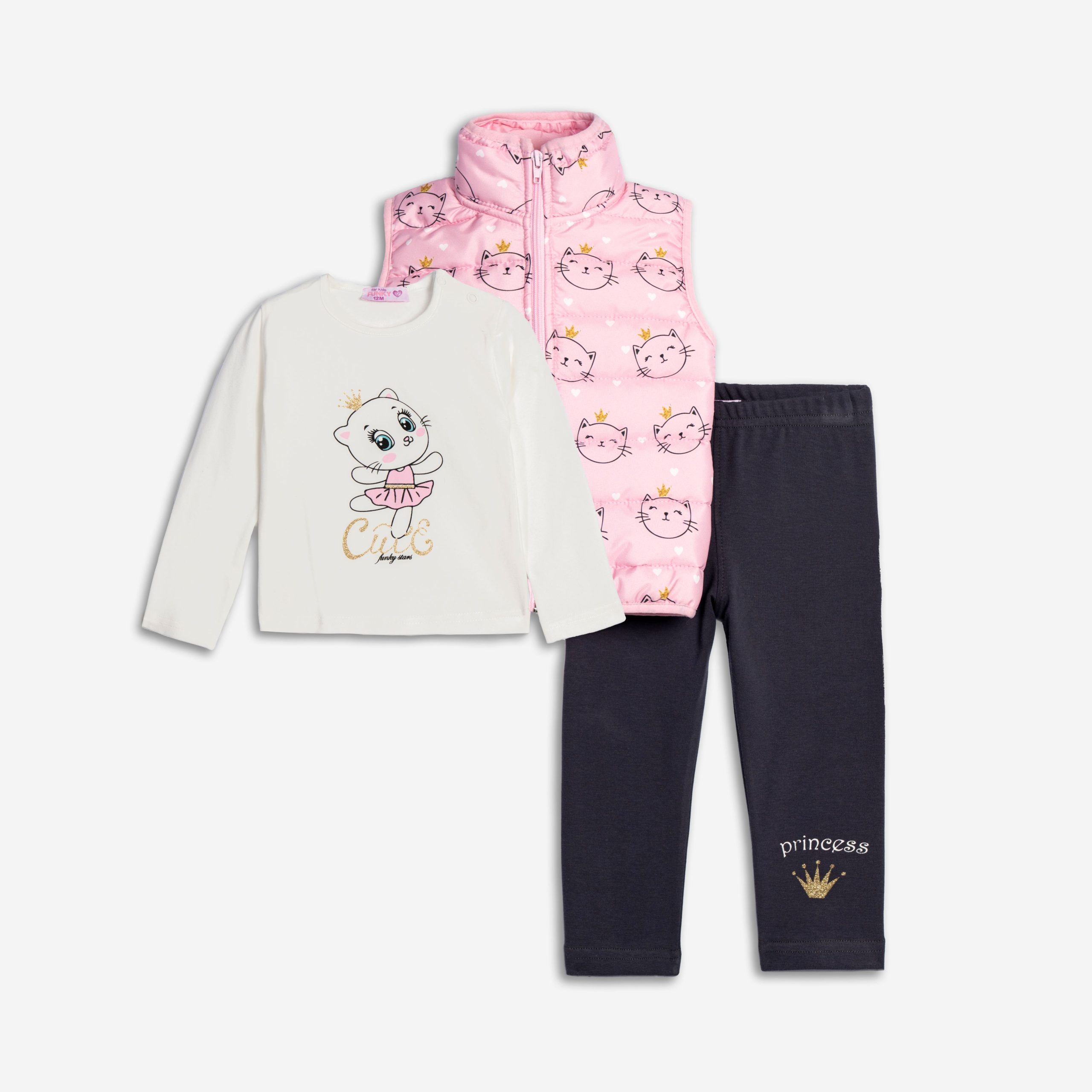 Σετ 3τεμαχίων αμάνικο μπουφάν με τσέπες και τύπωμα allover, μπλούζα κάλτσα λύκρα με τύπωμα (γάτα) και κολάν ριγέ βελουτέ για κορίτσι 6-24 μηνών σε χρώμα ροζ πούδρας allover/εκρού/ανθρακί