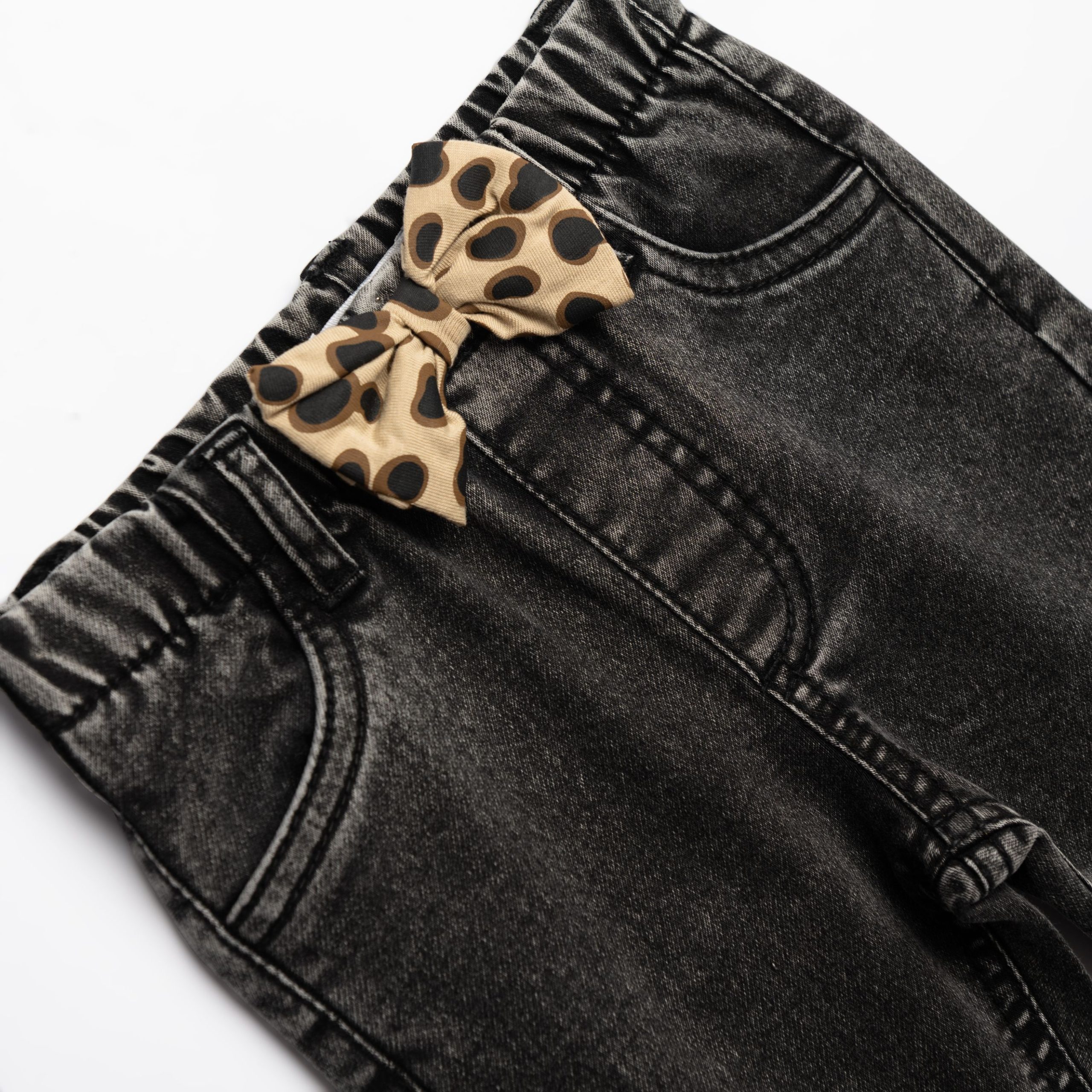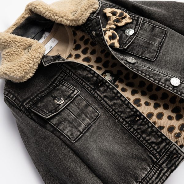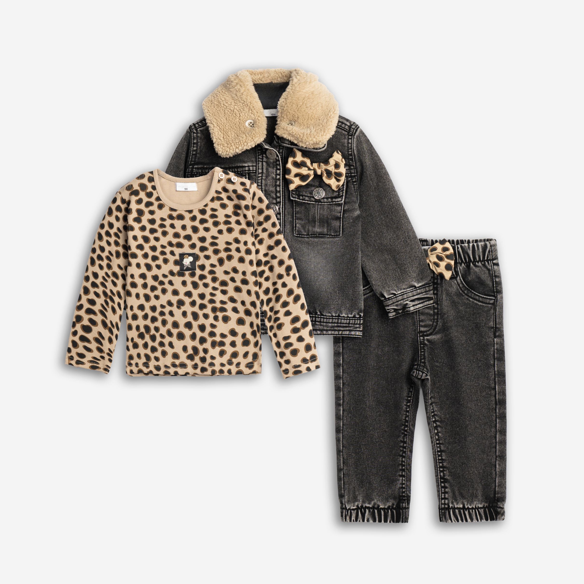 Σετ 3τεμαχίων τζάκετ τζινλύκρα μαλακό με γούνινο γιακά και τσέπες,μπλούζα με τύπωμα allover και παντελόνι τζην λύκρα μαλακό για κορίτσι 6-24 μηνών σε χρώμα μαύρο τζην/σκούρο μπεζ allover/μαύρο τζην