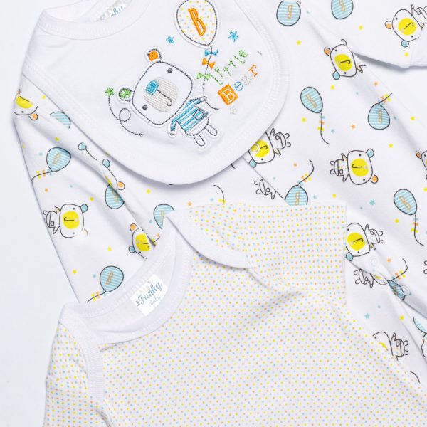Σετ 8τεμάχια φορμάκι,κορμάκι,σαλιάρα,σκουφάκι,γαντάκια και τρία πετσετάκια σε χρώμα τύπος βρεφάναπτυξη για 0-24 μηνών αγόρι