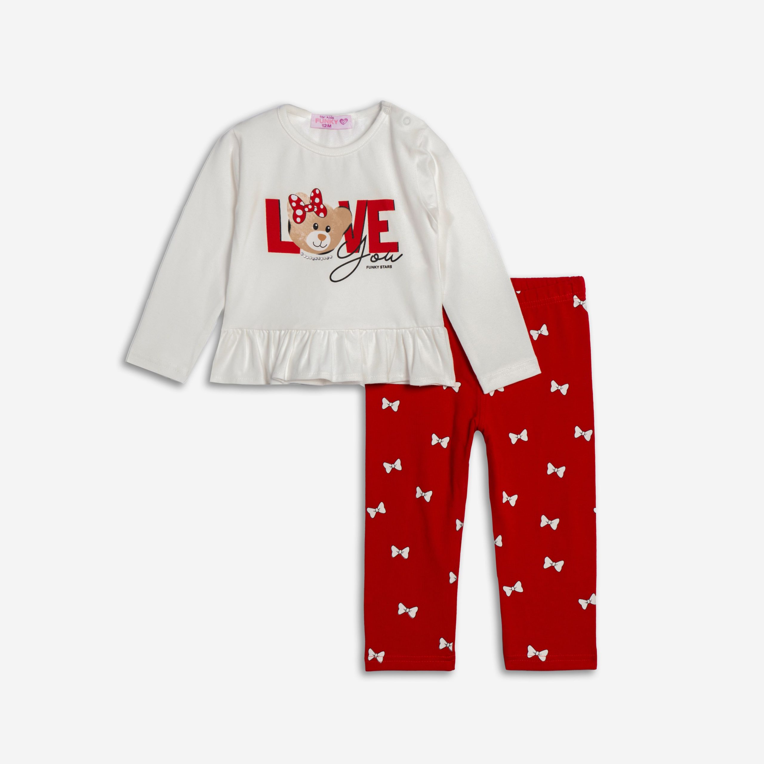Σετ μπλούζα κάλτσα λύκρα με τύπωμα (love) και κολάν φούτερ λύκρα για κορίτσι 6-24 μηνών σε χρώμα εκρού/κόκκινο allover
