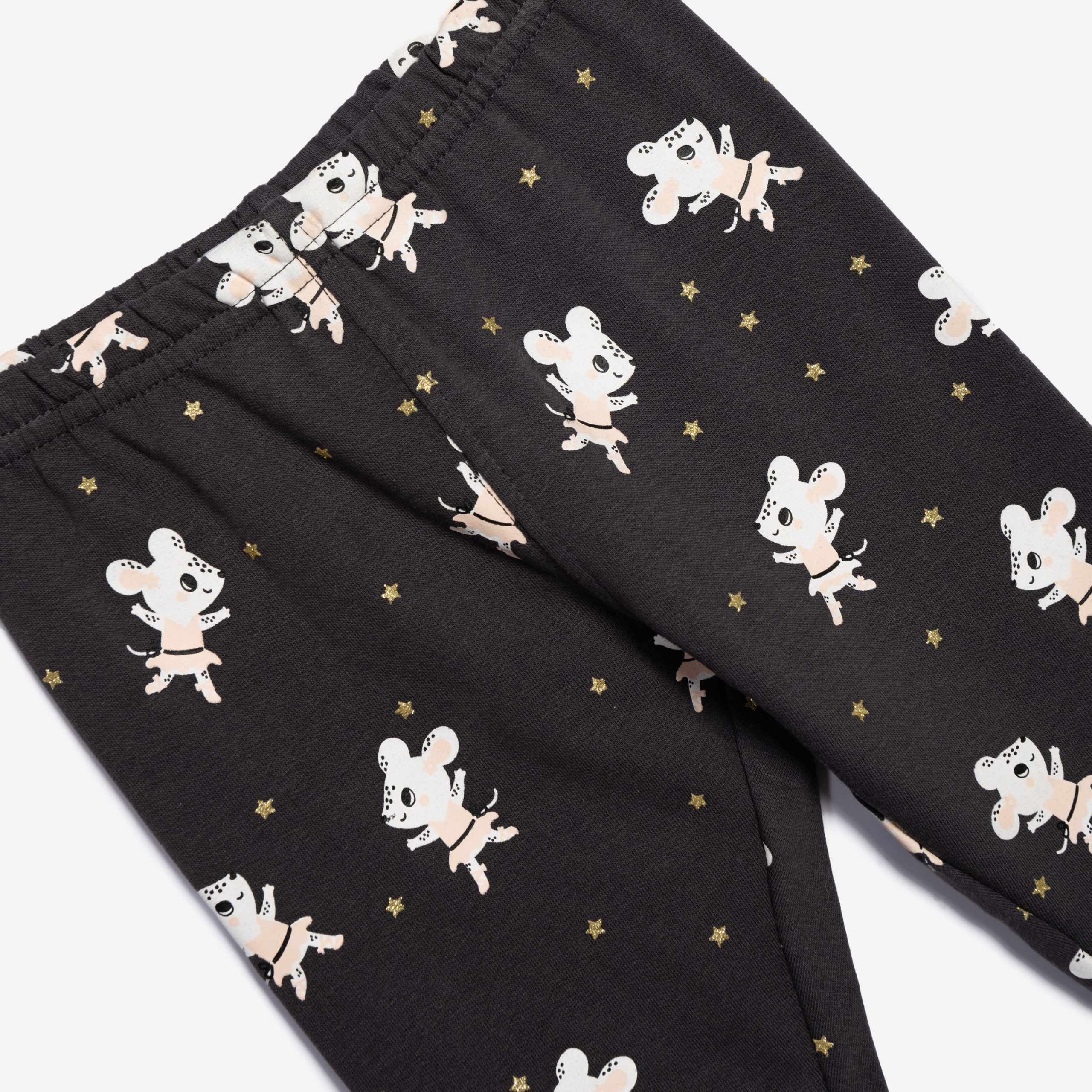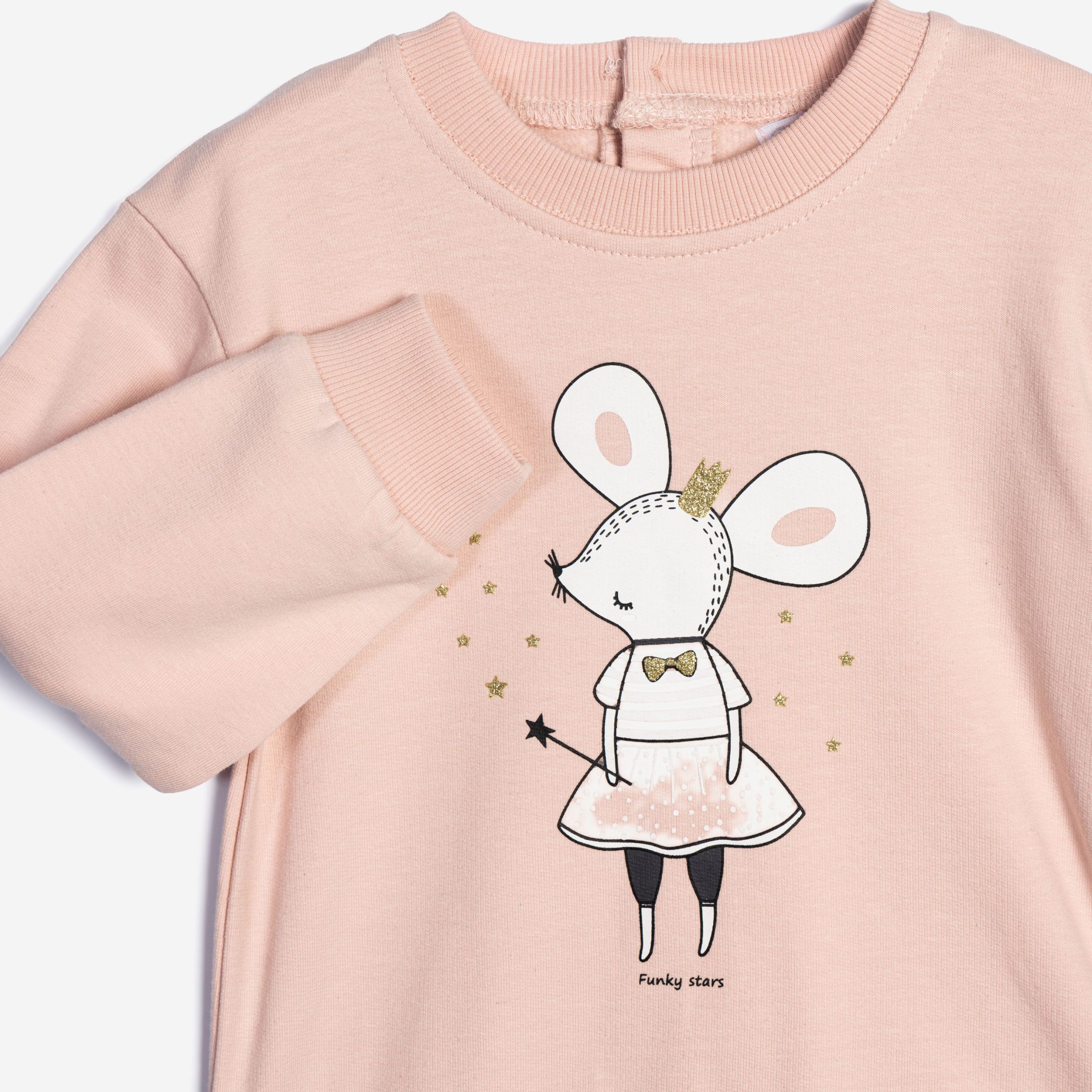 Σετ 2τεμαχίων μπλουζοφόρεμα φούτερ λύκρα με τύπωμα (ποντικίνα) και κολάν φούτερ λύκρα με τύπωμα allover για κορίτσι 6-24 μηνών σε χρώμα ροζ πούδρας/ανθρακί allover